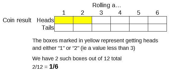 Of those 12 outcomes, shade in 2 boxes to represent getting heads and either a "1" or "2". Refer to the diagram below.