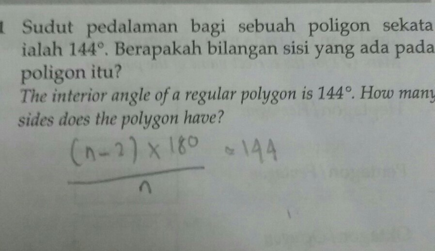 The exterior angle is 180 - 144 = 36 degrees.   n = 360/36 = 10
