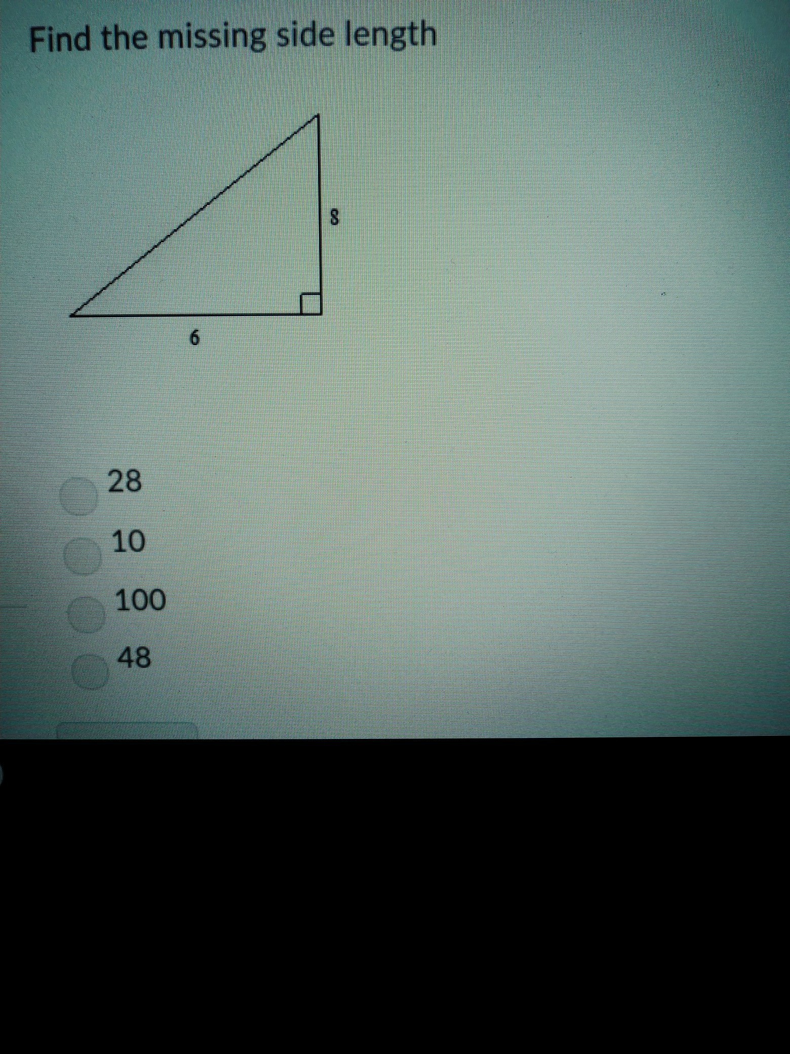 the missing is the hypotenuse = √(6² + 8² ) = √100 = 10