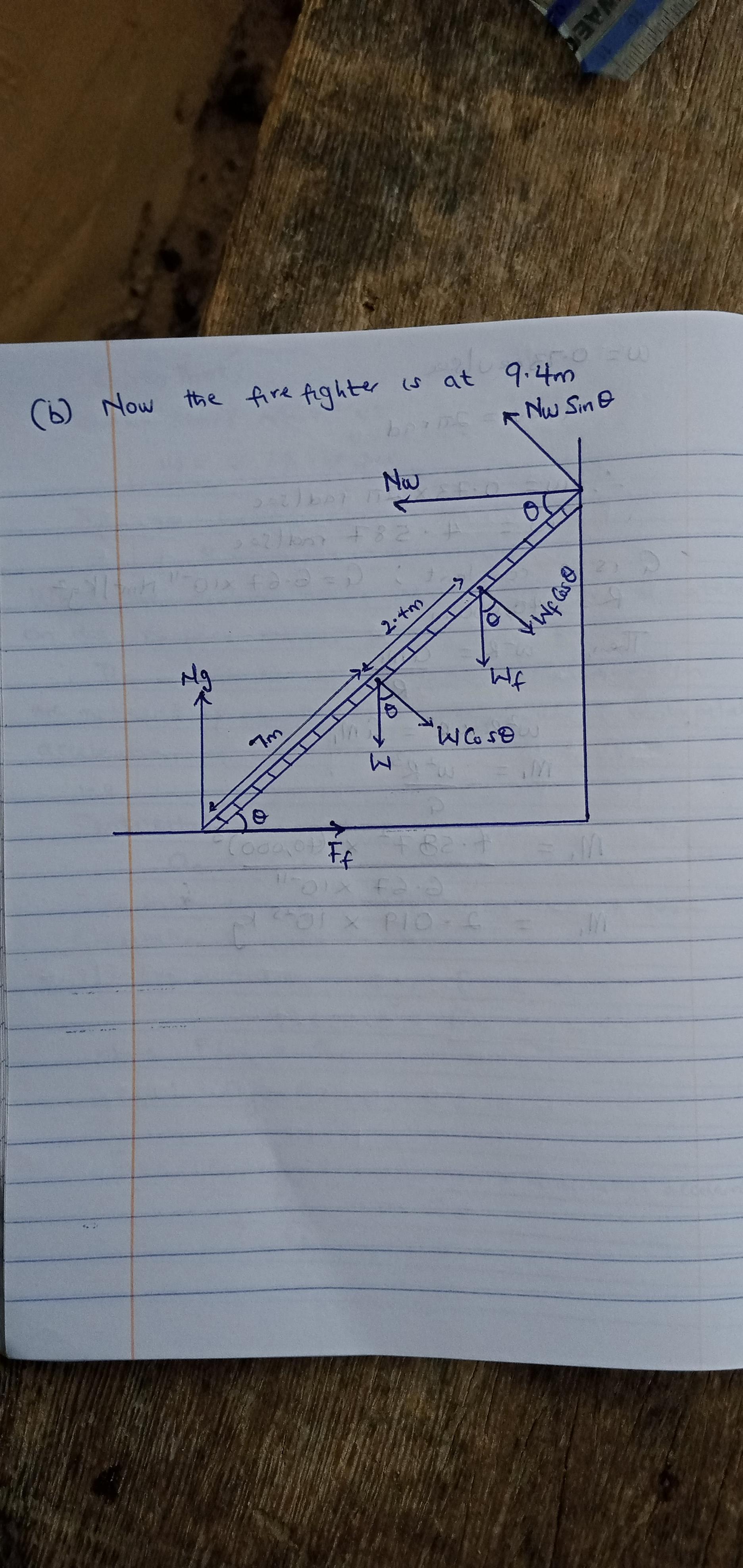 b. Now the firefighter is a distance of 9.4m from the horizontal and the ladder is about to slip