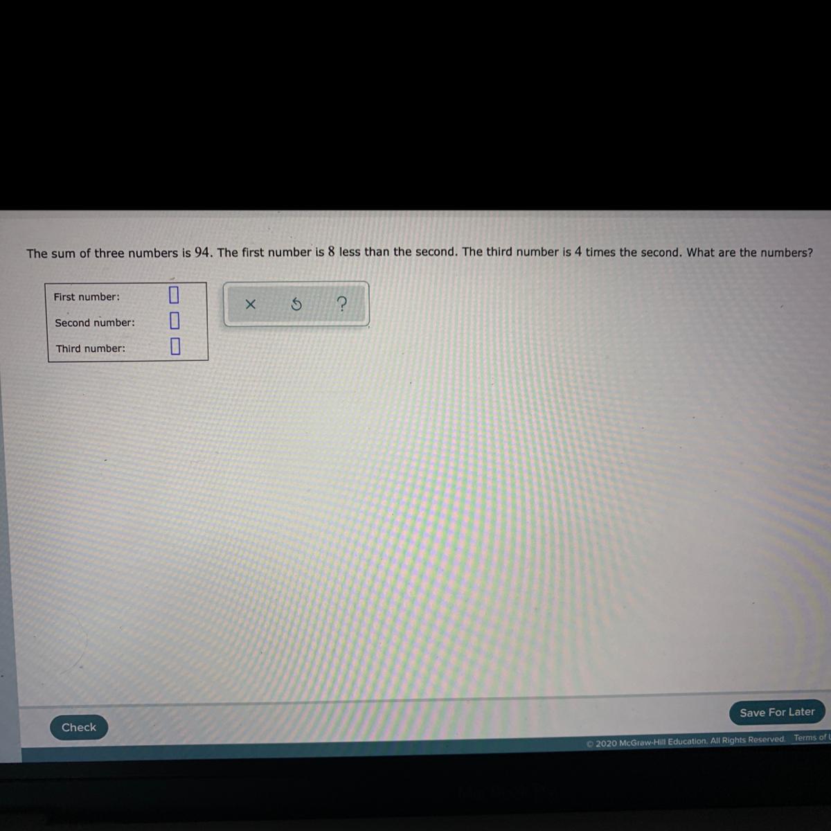 (s - 8) + (s) + 4(s) = 94 Solve for s to find the second number.