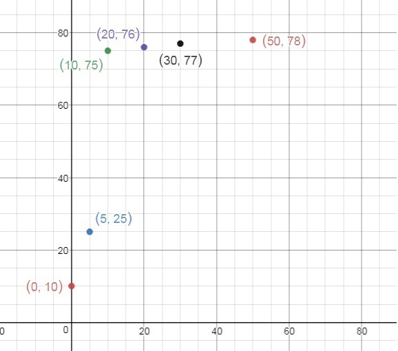 Consider points 1. (0, 10) and (5, 25) &2. (0, 10) and (10,75)