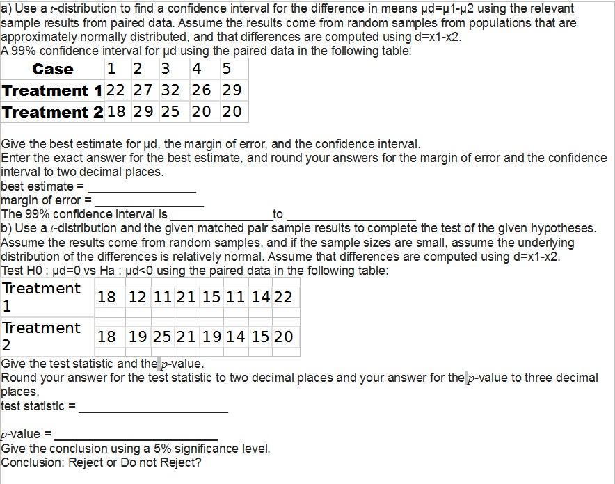 Use a t-distribution to find a confidence interval for the difference in means μd=μ1-μ2 using the relevant sample results from p