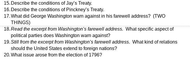 15) Jay's Treaty, which sought to settle outstanding issues between the two countries that had been left unresolved since American independence.