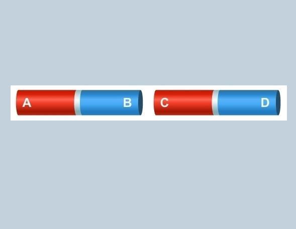 Question: Two magnets are placed as shown in the image. The force of (attraction or repulsion) between the poles B and C is (maximum or minimum) And the force of between the poles A and D is (maximum or minimum)