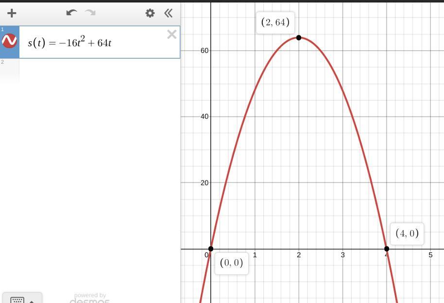 This is the equation of a downward-opening parabola with t-intercepts of 0 and 4. The maximum height is at the vertex, halfway between those values, at t=2. At that time, the height is ...