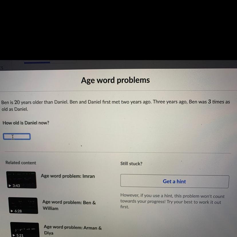 From there, let's go back three years ago.  We'll call Daniel's age x, and Ben's age will be 3x.  Ben's age is also equal to x + 20.