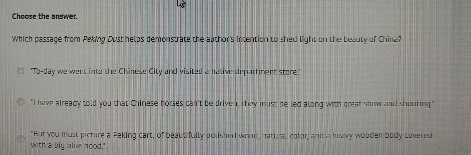 The passage from Peking Dust that helps demonstrate the author's intention to shed light on the beauty of China is the last one: But you must picture a Peking cart, of beautifully polished wood, natural color, and a heavy wooden body covered with a big blue hood. This is the sentence that is trying to convey the beauty of this city through numerous descriptions of beautiful things.
