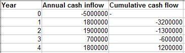 so, payback period = 3+\frac{600,000}{1,800,000}