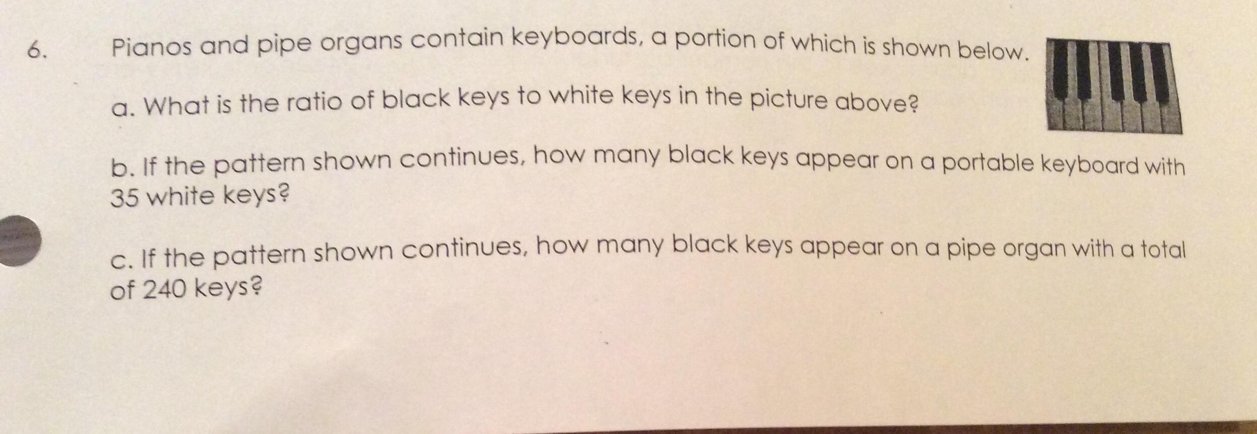 6a.) The ratio of black keys to white keys is 5:7. You count the black keys and count the white keys. 5 is the black keys and 7 is the white keys