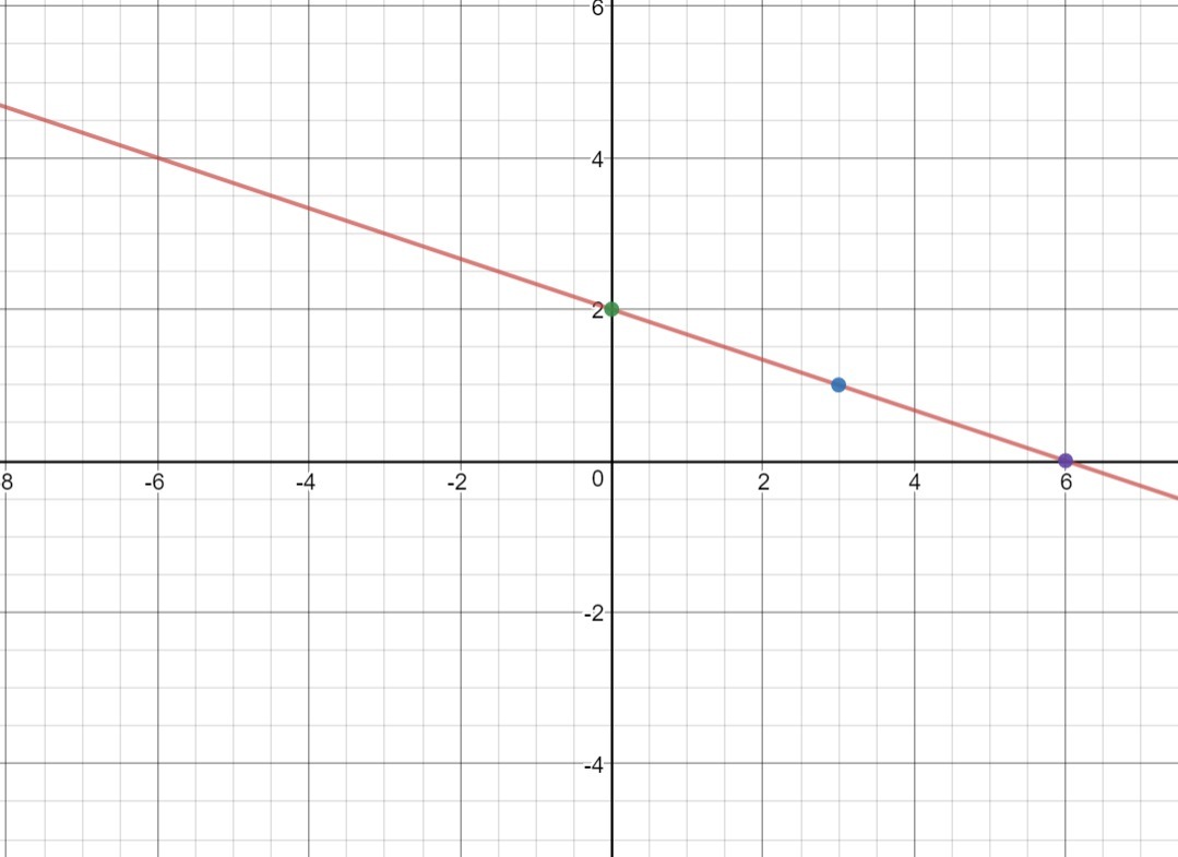 (0,2). That is one of the points. Now what does the slope represent? It is rise/run. Here it is -1/3. So from our y-intercept, (0,2), we can go down one unit and to the right 3 units. This new point is