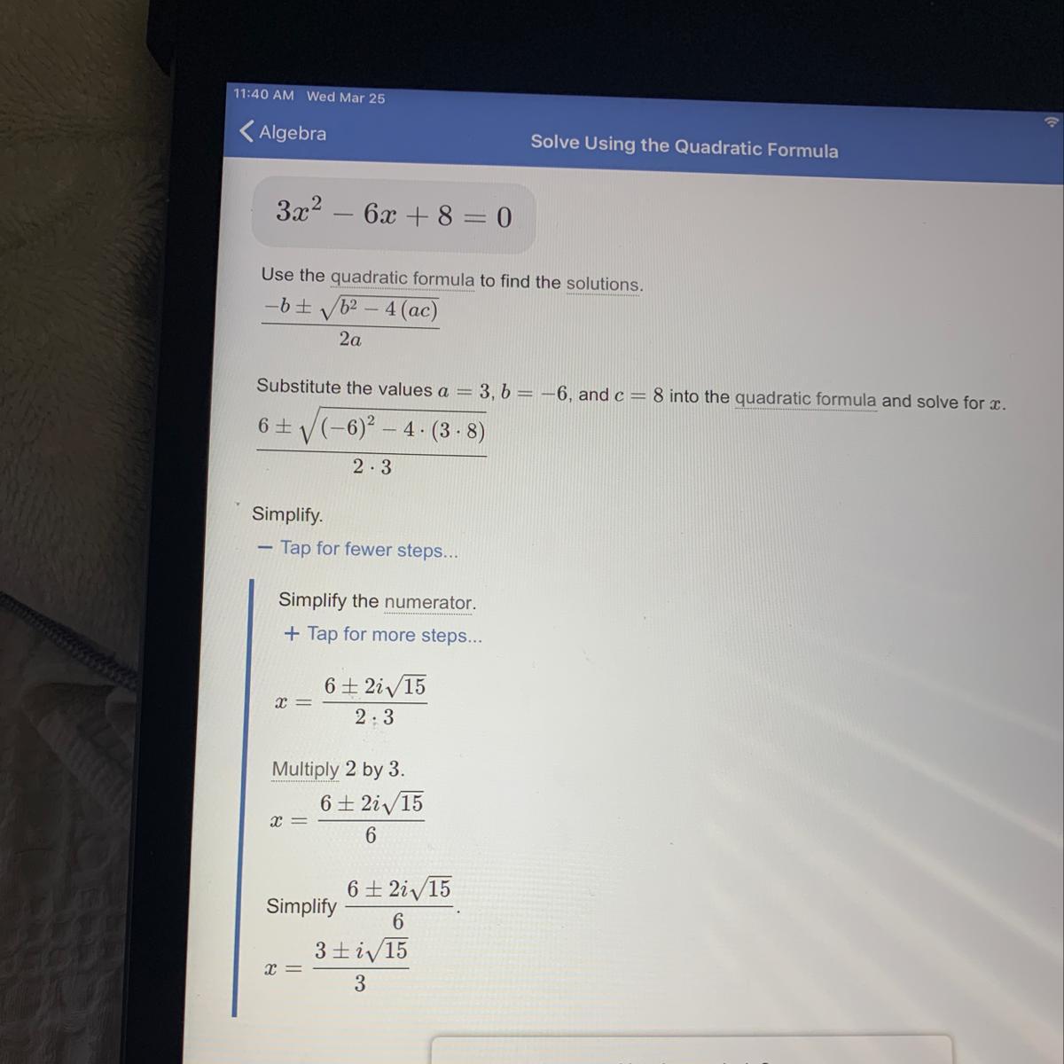 Sub values a=3 b=-6 c=8 in quadratic formula and solve for x