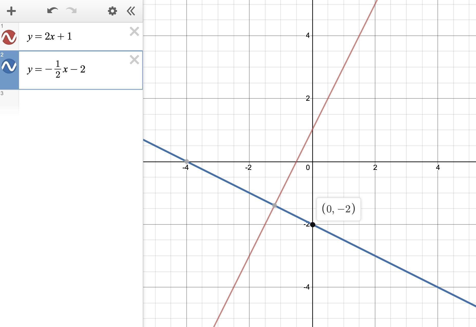 The given line has slope 2, so the perpendicular line will have slope -1/2, the negative reciprocal of the given slope.