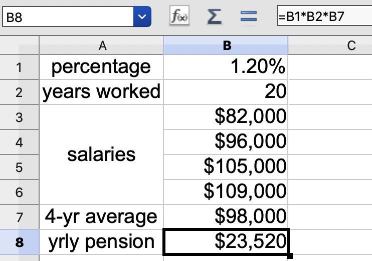 The value in B8 will be the product of the pension credit percentage per year worked, the number of years worked, and the average of the last 4 years' salaries. Those values are in cells B1, B2, and B7, so the formula is written ...