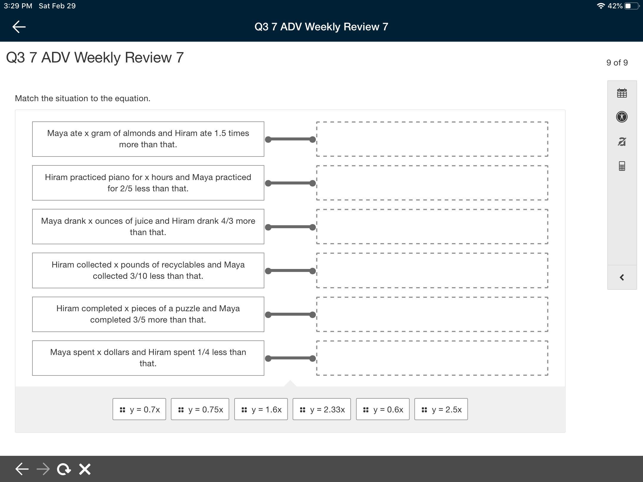 less than that. So Maya collected 0.3x pounds lesser than Hiram. So Maya collected, y = x - 0.3x = 0.7x.
