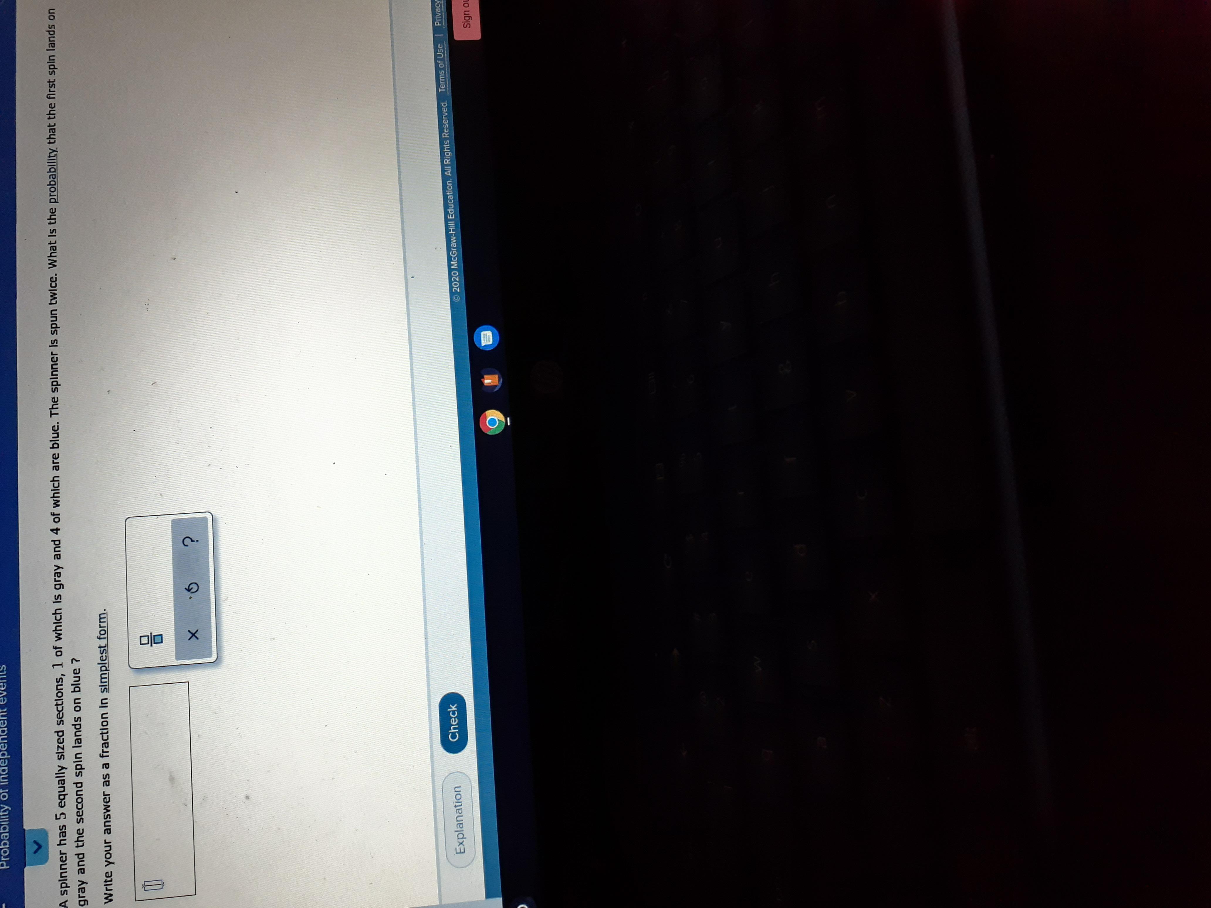 1/5*4/5 = 4/25, which is the probability that in 2 spins you will get one gray and one blue. Gray being first is 1/4th as likely as blue being first, though, so multiply 4/25 by 1/4 to get 1/25.