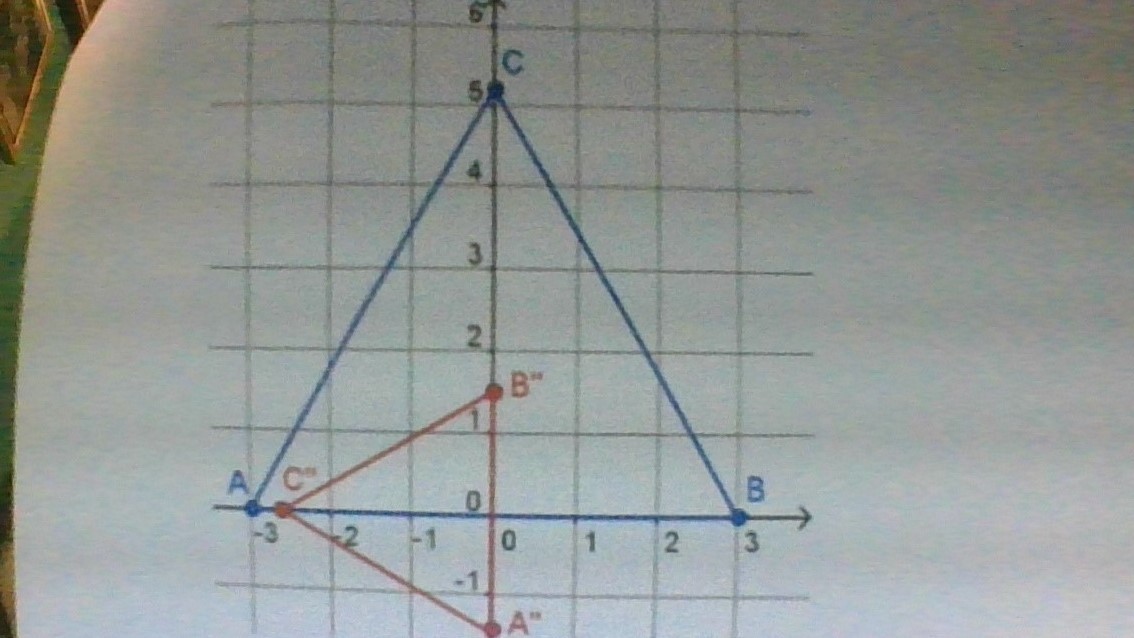 Identify a sequence of transformation that maps triangle ABC onto A"B"C" in the image below.