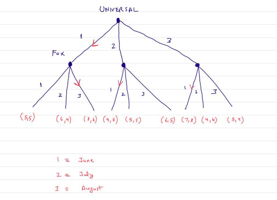 Thus, given the above information by backward induction, Universal will choose to release in June and then Fox will release in August leading to payoffs (8,6).