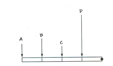Let us call forces acting on the rod, A, B, C, and D, and the separation between them x .