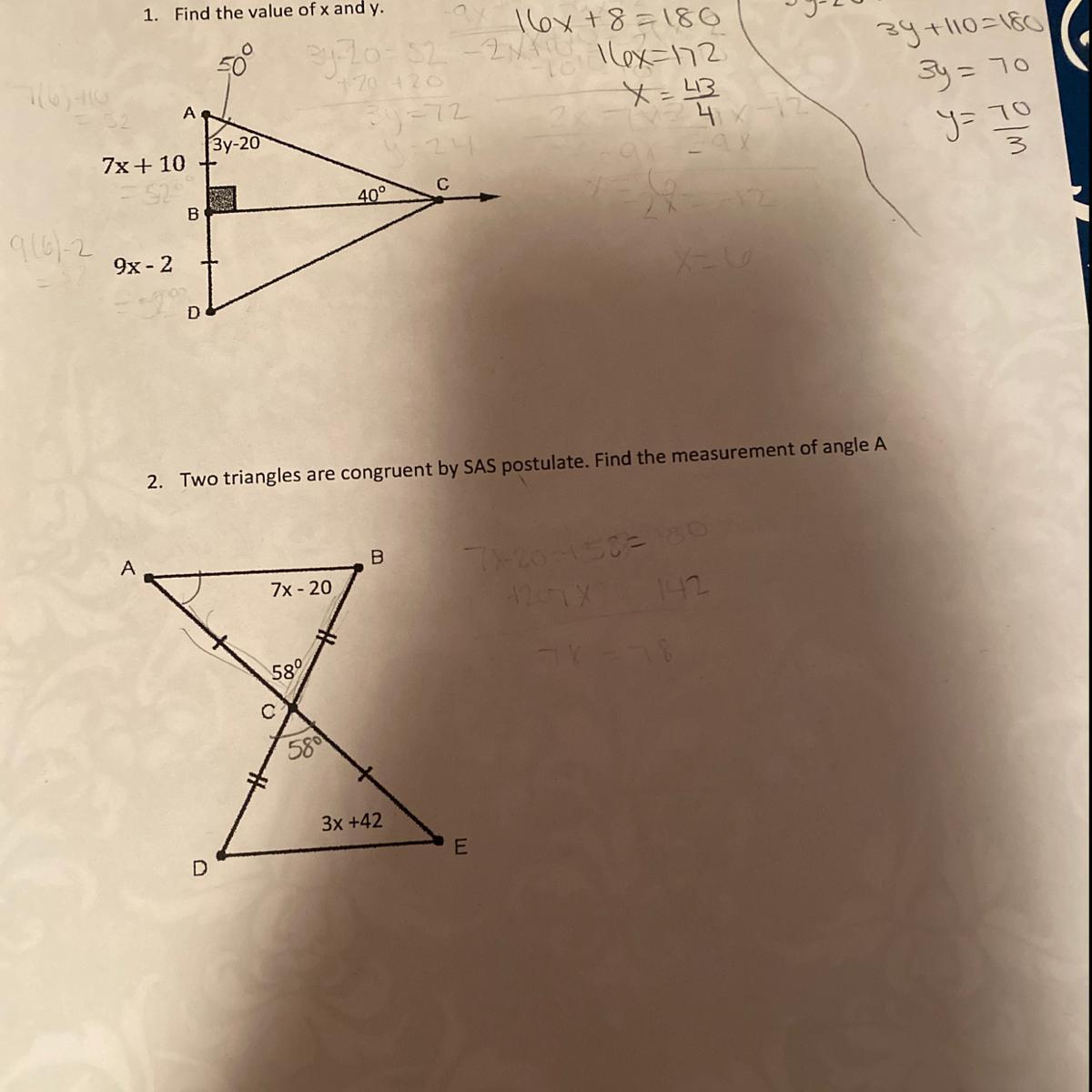 In case you didn't notice, 7x - 20 and 3x + 42 are not proportional, but angle A and 3x + 42 are.