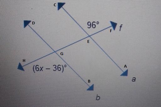 Given : Measure of ∠CEF = 96° and measure of ∠HGB = (6x -36)°