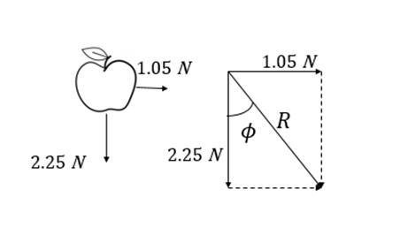 Wind blow, apple falls, gravitational force, wind force, magnitude of force, direction of force, 2.25N downward, 1.05N, magnitude and direction, net force on apple.
