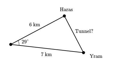 In the context of the question, a is the length of the tunnel (let's call this t), b is 6 km, c is 7 km and A is 29°.