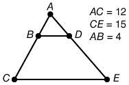 Since the triangles are of the same proportions, we can use ratios. AC and AB represent the same side. Putting the smaller numbers on top, AB/AC = BD/CE. 4/12 = BD/15. Cross multiply. 12BD = 60. Simplify. 12/12 BD = 60/12. BD= 5. I hope that helped.