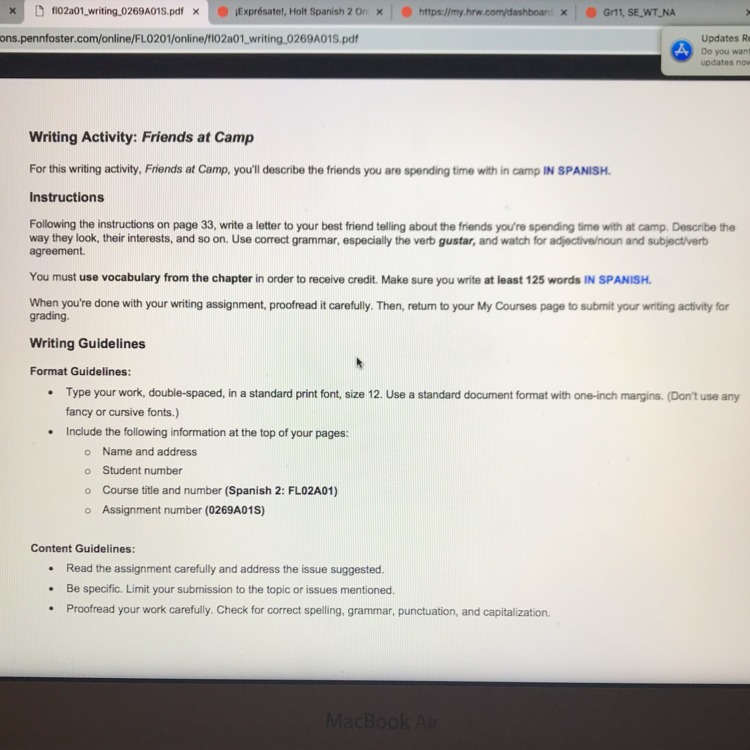 El campamento esta estupendo. Hay muchas personas, y e conocido a nuevos amigos. Pero en total, mis mejores amigos deben de ser Beatrice, Santiago, y Sebastian. Los 3 son muy différente pero si los conocieras te hubieran caído bien. Béatrice tiene 17 años, es la major de 5 hermanos, y es super activa. Esta pequeña de altura pero es muy feroz. Tiene cabello café castaño y los ojos verdez, como los arboles. Le gusta mucho ir de viajar y actuar. Con ella ha hido a más de 20 obras musicales y e hecho más amigos que antes. Santiago en el otro modo, es el contrario de Beatrice. Es el único hijo, y es super timido. Tiene 16 años y es el más menor de nuestro grupo. Su cabello es güero, y sus ojos azules claros. Le gusta mucho leer, y jugar al ajedrez; pero también le interesa mucho montar al caballo. Lo debes de mirar cuando hace carreras, no creo que e visto alguien mas veloz. Al final esta Sebastion, el es casi igual que Béatrice pero el es mas escandaloso. Sebastion el él pequeño de su familia, el tercer hijo. Tiene cabello rubio y los ojos cafés obscuro. Si quieres tener una noche de diversión el es el hombre. Sebastion viene de una familia rica, por eso gasta a lo tonto. Le gusta hacer carrera de autos, y esta semana tiene una motocicleta para competir en una nueva carrera. Es muy extremo pero es bien honda. Si son muy différente los tres, pero lo que no es uno es el otro y eso es lo mas divertido--especialmente cuando se poner a perliarze por cosas pequeñas. Deseo que los conocieras pero al fin no puedes venir, a lo mejor la próxima vez hablo con el consejero y hablamos por video para que lo conoscas. Te extraño mucho amigo/a te miro en un mes. Queridamente (your name)