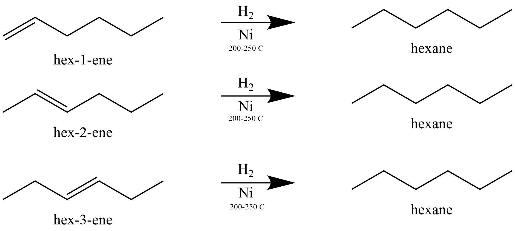 Below three different reactions are given in which the starting materials (Alkenes) have molecular formula C₆H₁₂ and the final product in all three reactions is the formation of same Alkane with the formula of C₆H₁₄.
