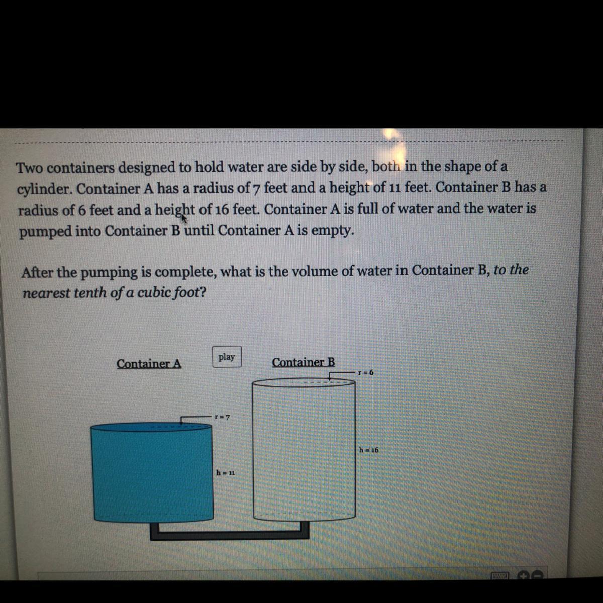 Thus; Volume of container A = π•(7²)•11 = 1693.318 ft³