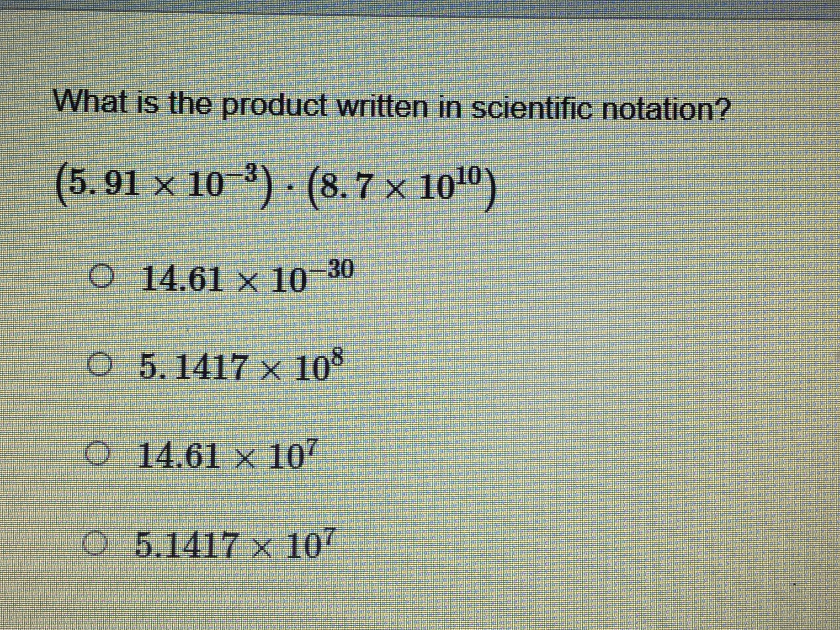 We have 5.91 * 8.7 = 51.417, and 10^(-3) * 10^10 = 10^(10 - 3) = 10^7, so the original product above reduces to