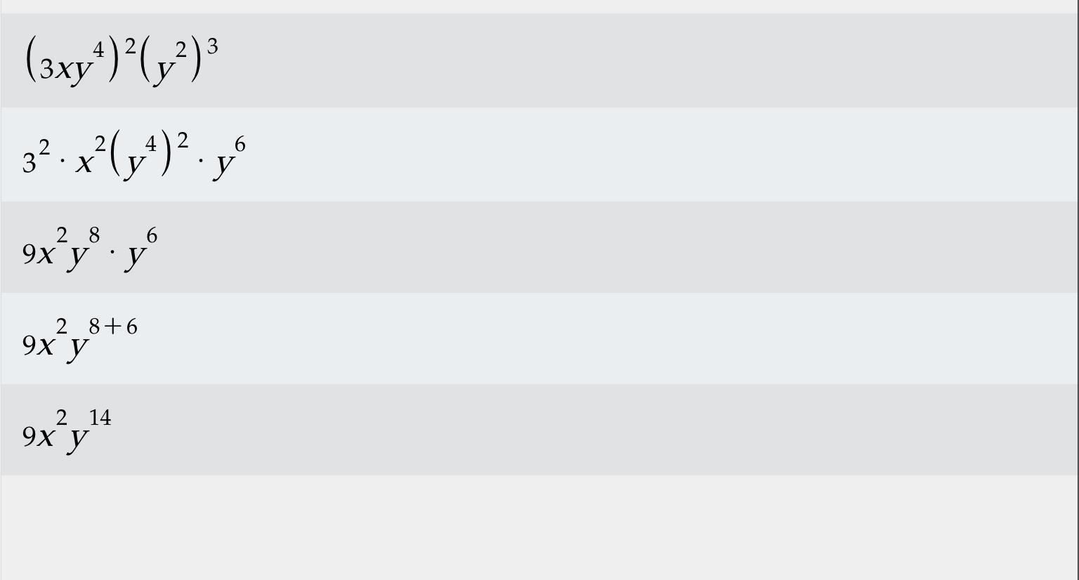 Chose the correct simplification of the expression (3xy^4)^2(y^2)^3​