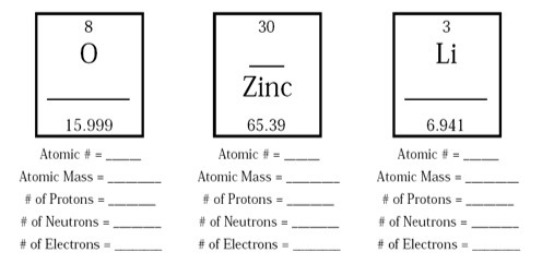 The number of neutrons for oxygen is 8, for zinc it is 35, and for lithium is 4. To find the number of neutrons you have to do atomic mass - atomic number.I rounded the answers to find the #of neutrons.