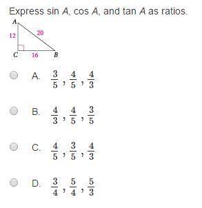 Substitute 16 for the opposite and 20 for the hypotenuse. This yields: