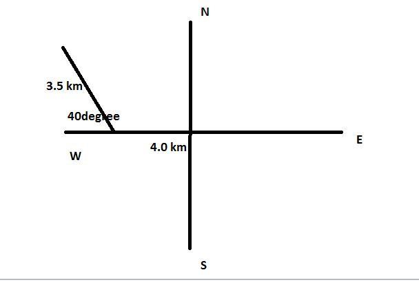 Geese fly 4.0 km due west, then turn to north by 40° and fly another 3.5 km.