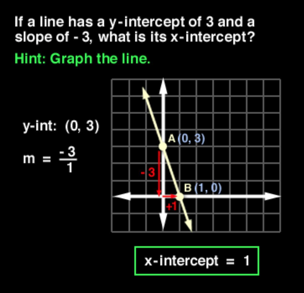 From there, our slope of -3 can be thought of as -3/1 so we go down 3 units and to the right 1 unit and plot point B. Notice that point B happens to lie on the x-axis at (1,0) and remember that the x-intercept is the point where the line crosses the x-axis. Since our line crosses the x-axis at the point (1,0), it has an x-intercept of 1.