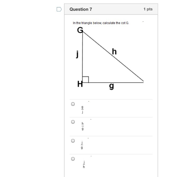For angle G, find the adjacent and opposite sides of the given triangle. These are j and g, respectively. Simply put those into the contangent function, and you have your answer.