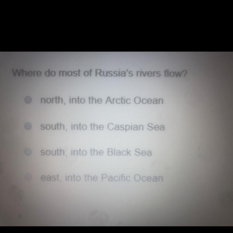 where do most of russia's rivers flow? north, into the arctic ocean west, into the black ocean, east, into the Pacific Ocean, south, into the Caspian sea.