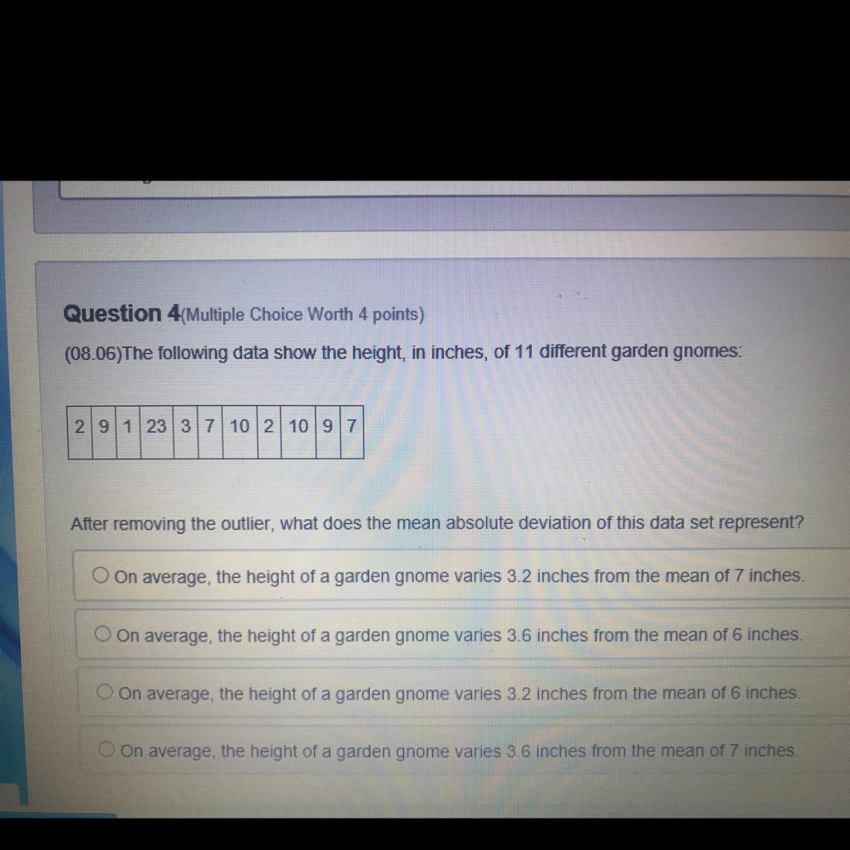 1. The <em>outlier is 23 inches</em>, it is very big compared to the other numbers.