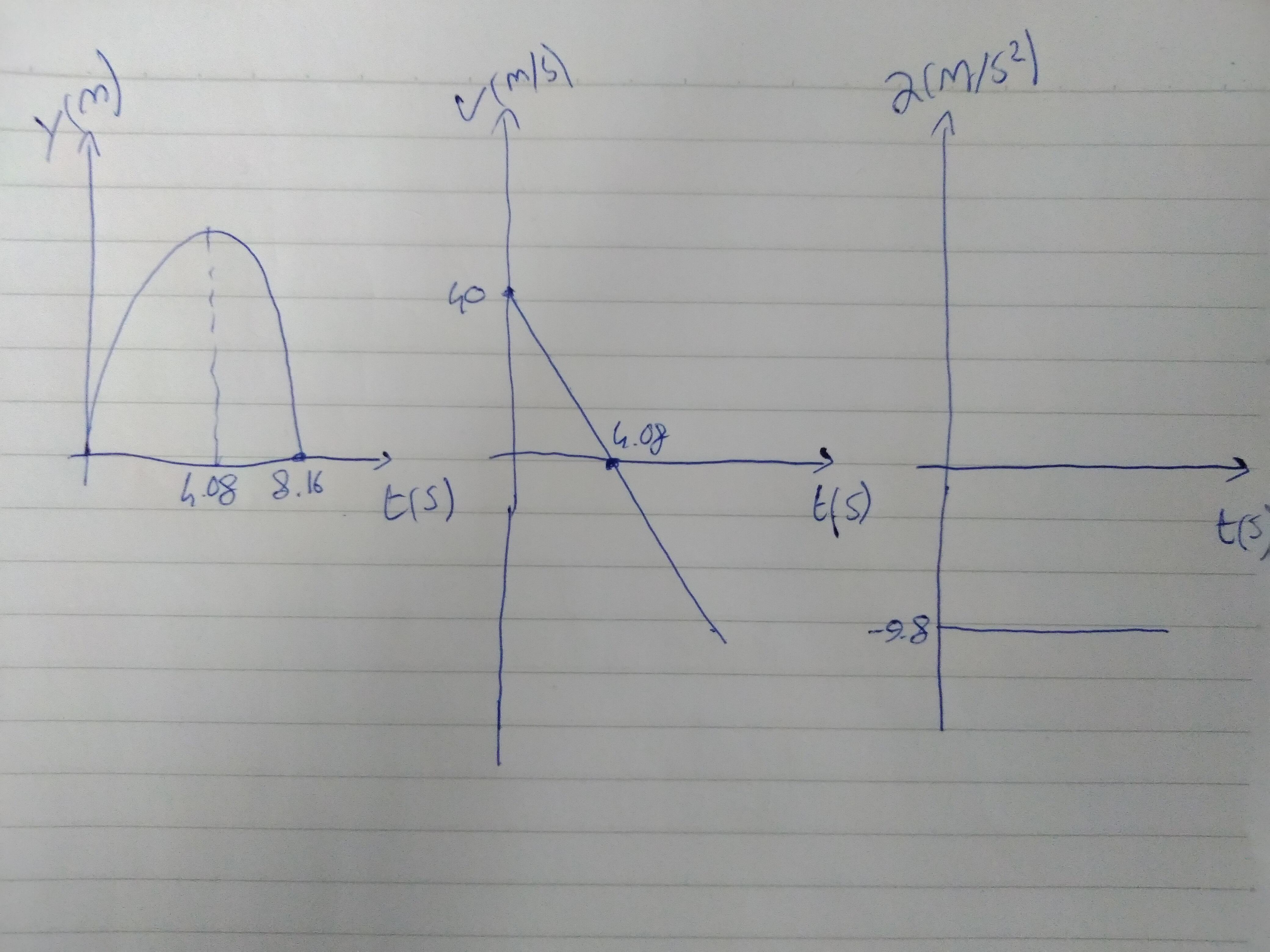 - Velocity-time graph: the initial velocity is +40 m/s; then it decreases linearly (because the acceleration is constant), and becomes zero when t = 4.08 s. Then the velocity becomes negative (because the boulder is now moving downward) and its magnitude increases.