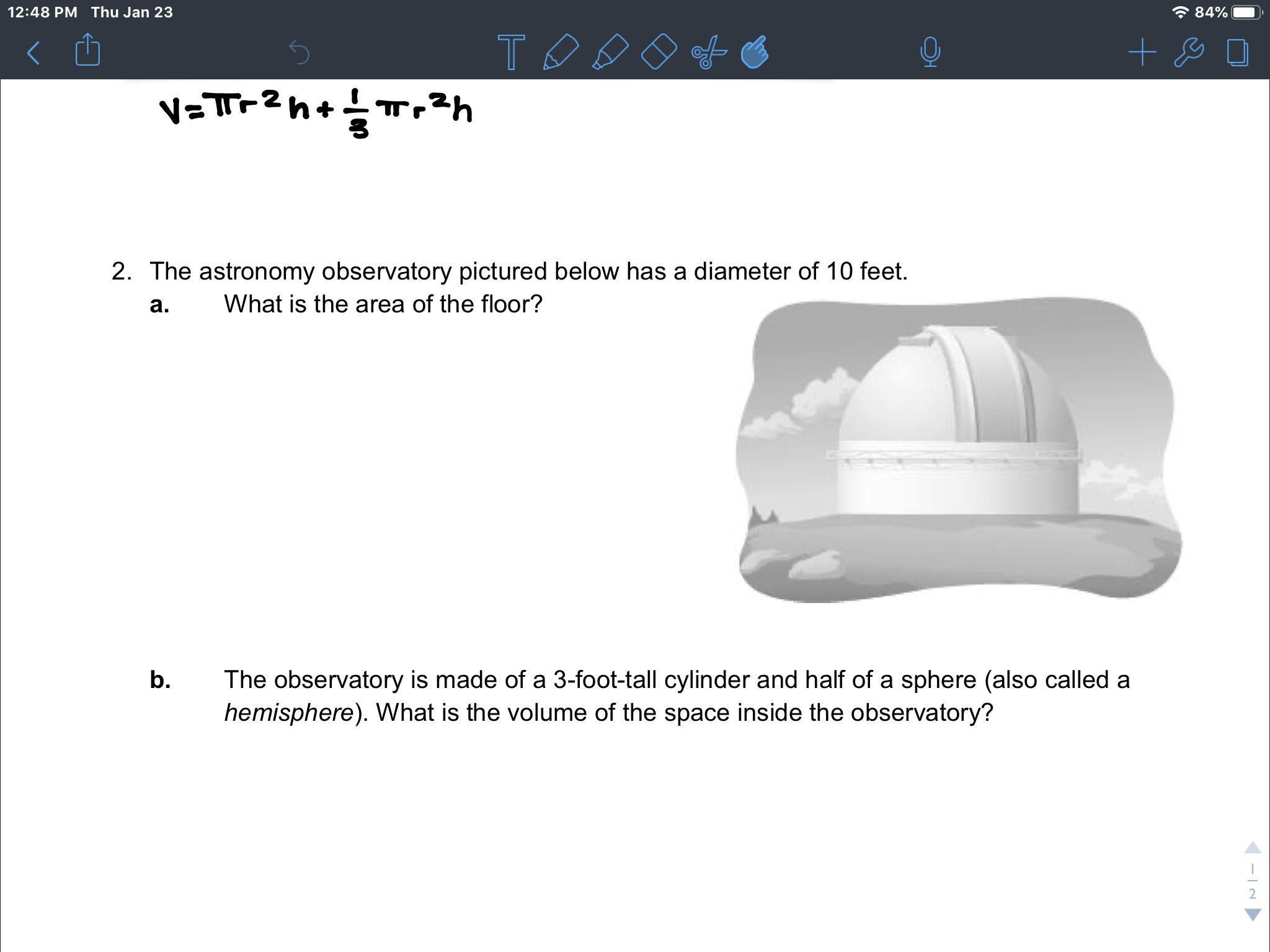 i) The diameter of the floor is 10 feet. The floor is circular and has a radius,