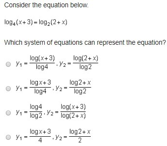 Consider the equation below. log4 (x+3)=log2 (2x). Which system of equations can represent the equation?