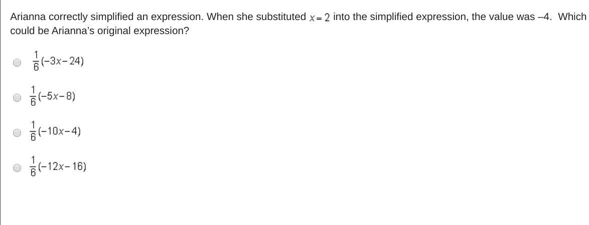 NEED HELP ASAP! Arianna correctly simplified an expression. When she substituted \ into the simplified expression, the value was –4. Which could be Arianna’s original expression? One-sixth (negative 3 x minus 24) One-sixth (negative 5 x minus 8) One-sixth (negative 10 x minus 4) One-sixth (negative 12 x minus 16).