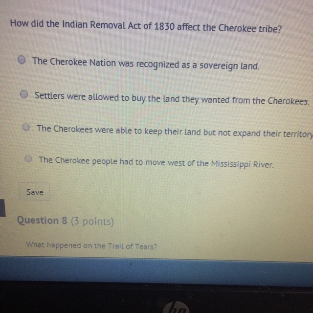 I believe it would be A. the reason for this is because the Cherokees were considered unthreatening during the time. The Cherokees refused to sell their lands. It wasn't until 1828 when the policy changed and they appeared in court arguing their rights as a "civilized tribe"