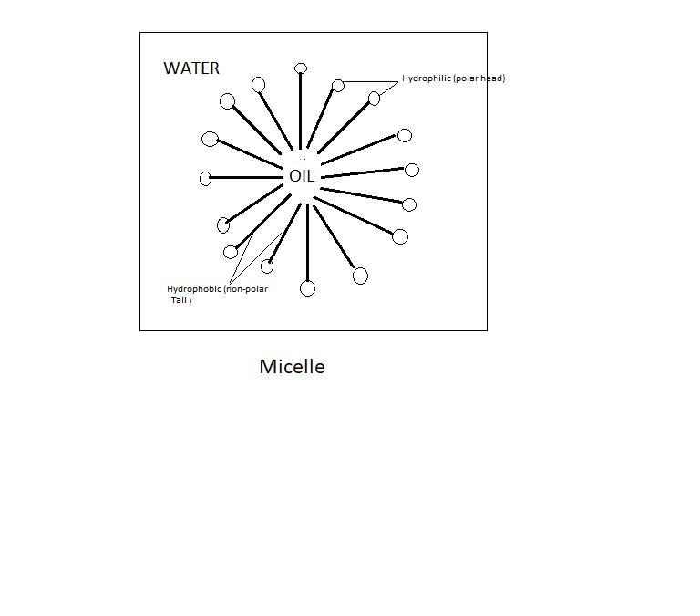 When soap water is added with stain or oil, soap molecules form micelles which are the tiny clusters of soap molecules representing hydrophilic head (water-loving) points outwards that sticks to the water and hydrophobic tail (oil-loving) points inwards that stick to the oil and trap oil in the center.