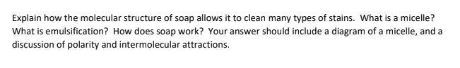 4. As we discussed earlier, Soap has hydrophilic (water-loving) carboxylate group (-CO2) that form hydrogen bonds and ion-dipole interactions with water and the hydrophobic (water-fearing) tail carry nonpolar hydrocarbon chain that interacts with a stain by forming micelles through dispersion force.