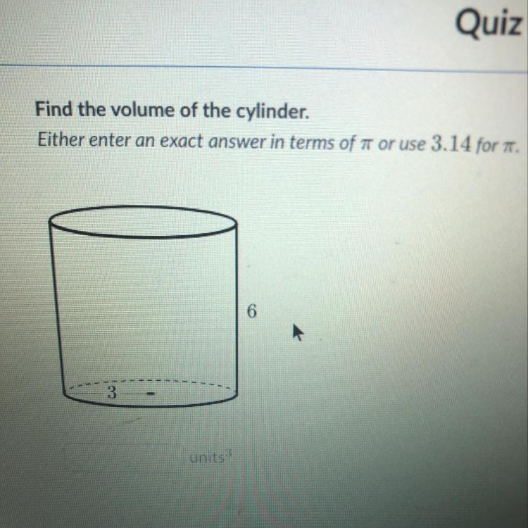Find the volume of the cylinder Either enter an exact answer in terms of Pi or use 3.14 or Pi