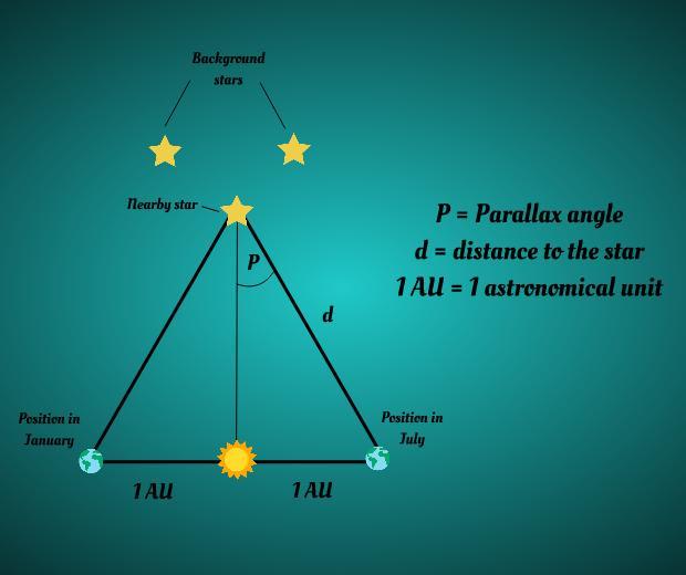 Equation (2) represents the distance in a unit known as parsec (pc), that is the distance of a star with a parallax angle of 1 arc second.