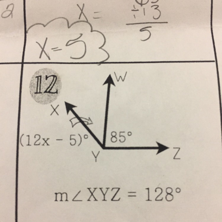 12x-5+85=128.......12x+80=128......12x+80-80=128-80....12x=48...... divide both sides by 12 to get x=4. Now most people do not complete solving for the missing value....12(4)-5=43 degrees